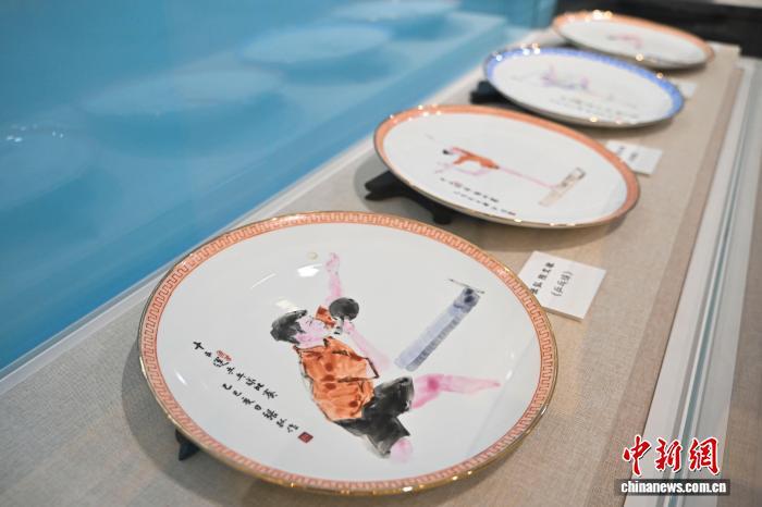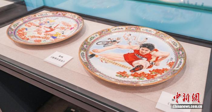 展览中,还有其他广彩创作者以体育项目、体育健儿为题材创作的广彩瓷盘。
